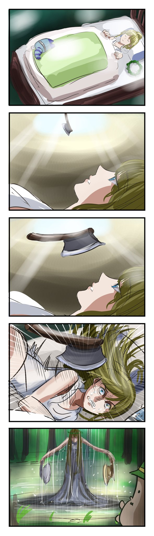 推主畫出在湖底休息的女神,感覺睡得非常安穩,一切都非常平靜。直到空中出現了一把斧頭,越來越近,差點砸到女神 XD,只好拿起斧頭上工浮出湖面... ( 怎麼有種血汗勞工的感覺... )。