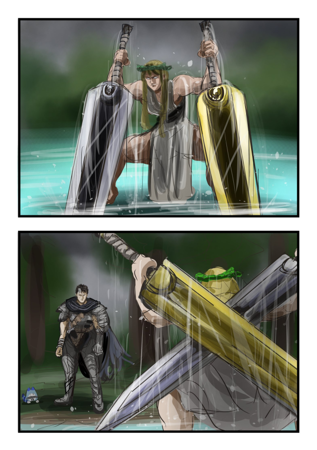 推主也發揮創意,以《烙印勇士》的風格出發,改為凱茲將屠龍劍掉落湖中的反應。「你掉的是這把金色的屠龍大劍還是銀色的屠龍大劍呢?」,連女神也變為了烙印勇士的風格,筋肉爆發的模樣也讓不少日本網友爆笑 XD。