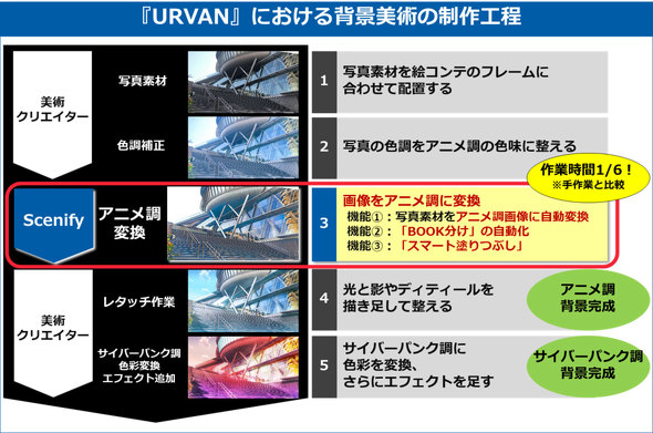 由『URVAN』的動畫背景製作的步驟大約分為 5 個,從配置圖片、色調補正、動畫色調的轉換、後續微調整、Cyberpunk 風格的調整,才能真正成為可以使用的素材。也公布了實驗動畫作品『URVAN』中採用的製作工程步驟,主要在動畫色調轉換這一個步驟中,Scenify 能夠提供自動化的調整效果,預計將比一般人工省去六分之一的時間,成品也合乎要求。