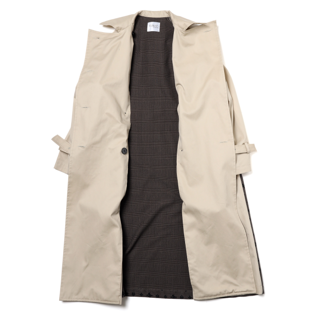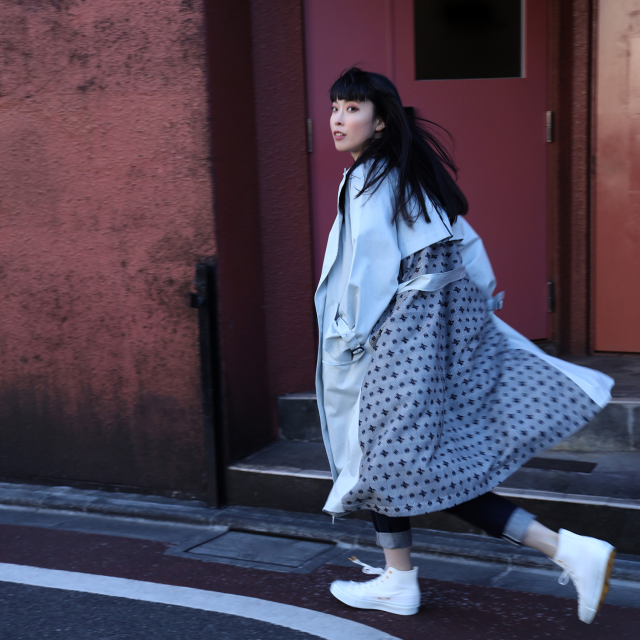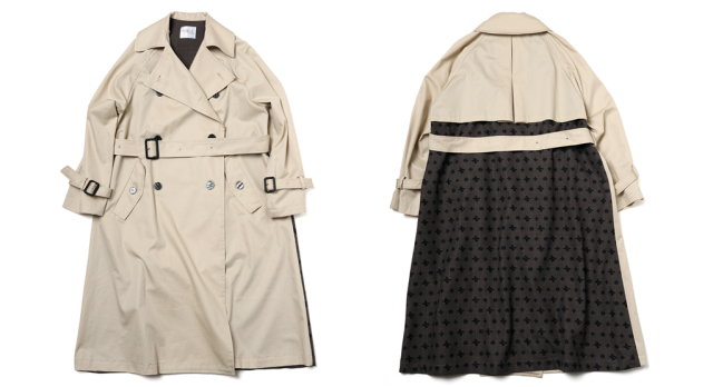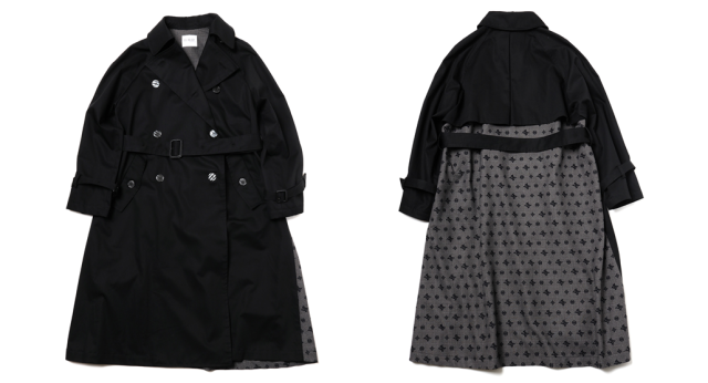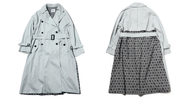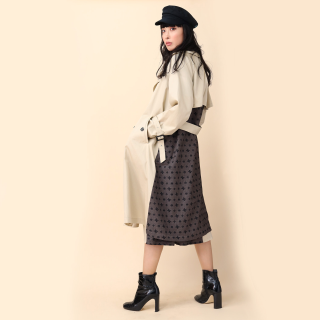 這次 RADIO EVA 將這款服裝實體化,不但將廣告中的服裝忠實還原,以春季的風衣款式為設計,正面看似簡單的長板風衣外套,背面則將滿版圖騰的洋裝與風衣外套兩者不同的材質融合為一,呈現出優雅又不失單調的一件式穿搭,絕對是春季女性穿搭的一個好選擇。