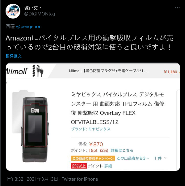 底下留言也有網友建議最好使用這種有撞擊吸收作用的保護貼,即使真的手一滑不小心傷到了手錶,也不用擔心直接陣亡,事實上在手環發行之前,日本就已經有第三方廠商推出了「數碼寶貝 育成手環」專用保護貼,而且就連先前的方塊機都有。