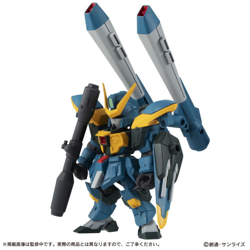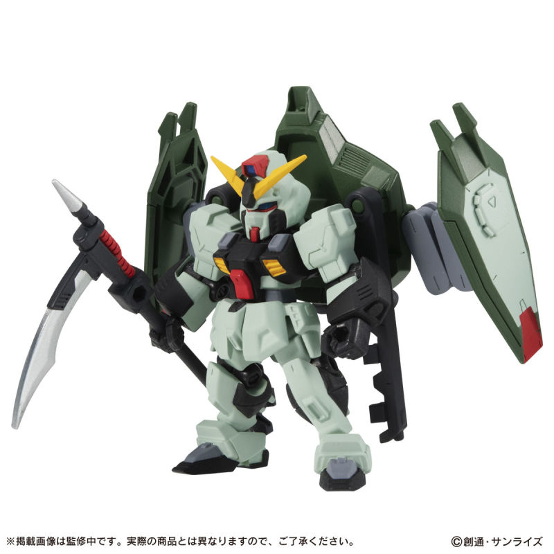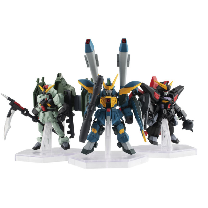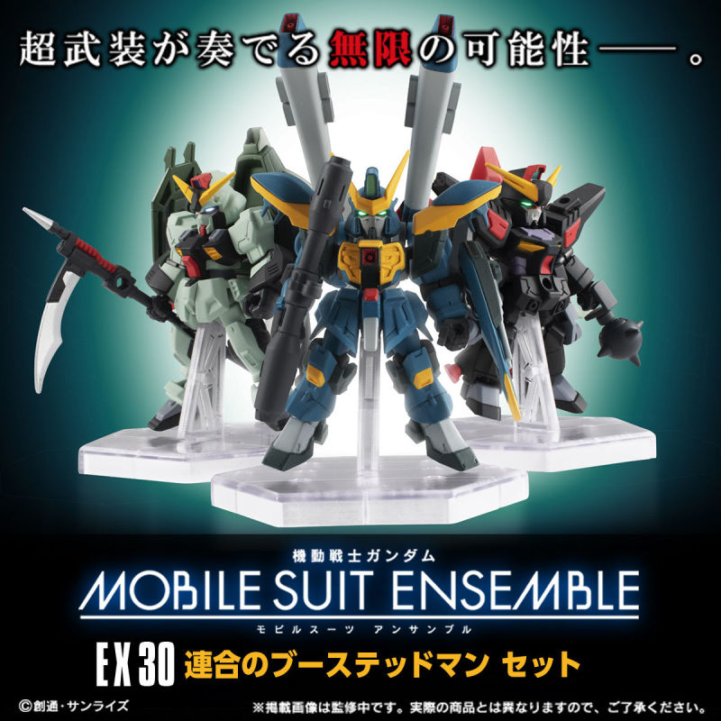 「MOBILE SUIT ENSEMBLE EX30 聯合軍強化人套組」同時收錄瘟神鋼彈、侵略鋼彈、禁斷鋼彈三架地球聯合軍所開發的強化人用 GAT-X 後期系列機,藉由系列特色的造型比例再現各機獨特的武裝與變形後的狀態。