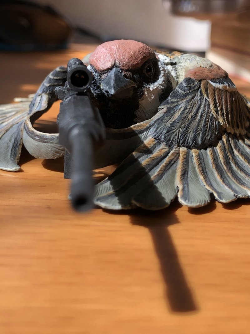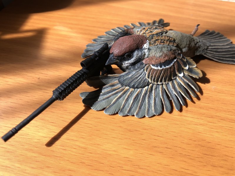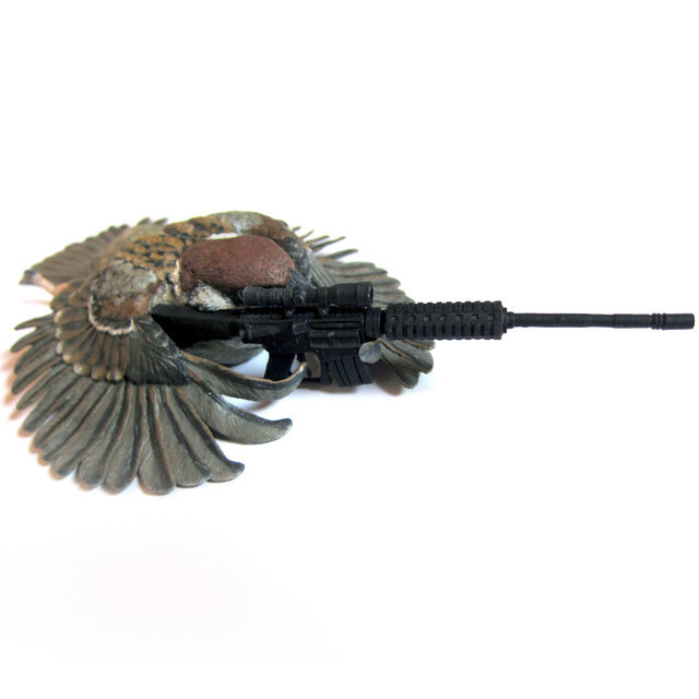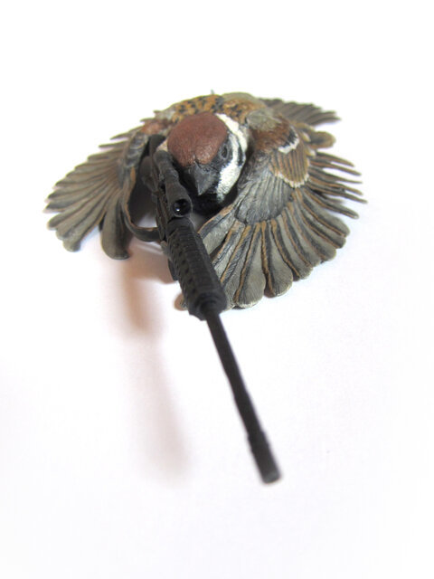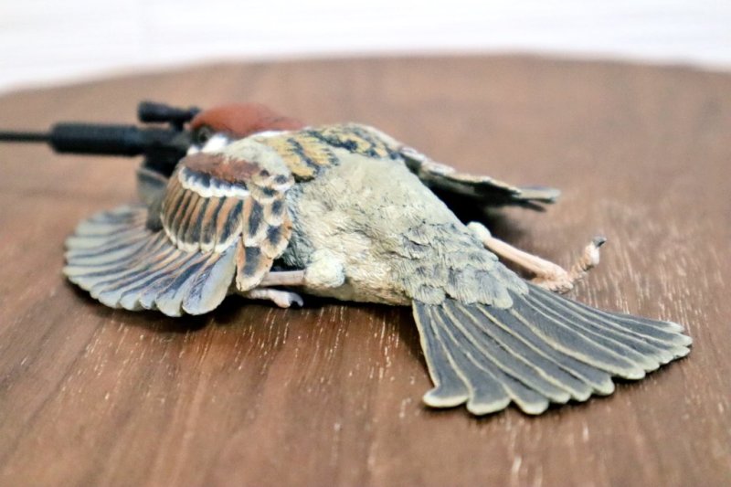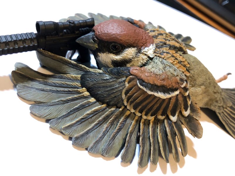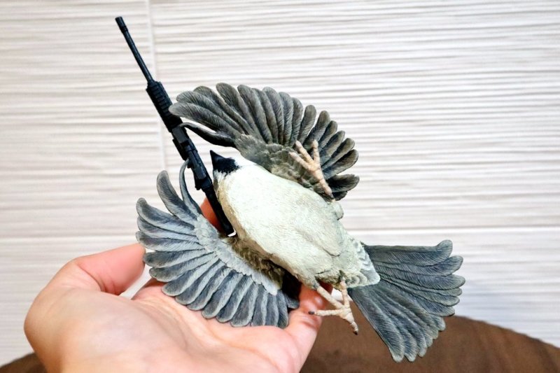而先前 ヤトウナオコ 以樹脂製作的全新系列作品「麻雀狙擊手」模型,因粉絲們強烈敲碗終於商品化!在將近 1:1 真實比例的 16 × 12公分尺寸中,栩栩如生還原麻雀的羽毛細節、展開的雙翼和炯炯有神的雙眼等,並以純手工細膩塗裝,將特徵毛色仔細擬真呈現;底部看精細的腹部小細毛與生動的小腳,滿滿細節令人驚豔~最重要的是巧妙地把麻雀趴姿動作結合狙擊槍,可愛的小麻雀瞬間變成煞氣狙擊手!再說麻雀雖小?小心下一個被瞄準的就是你!