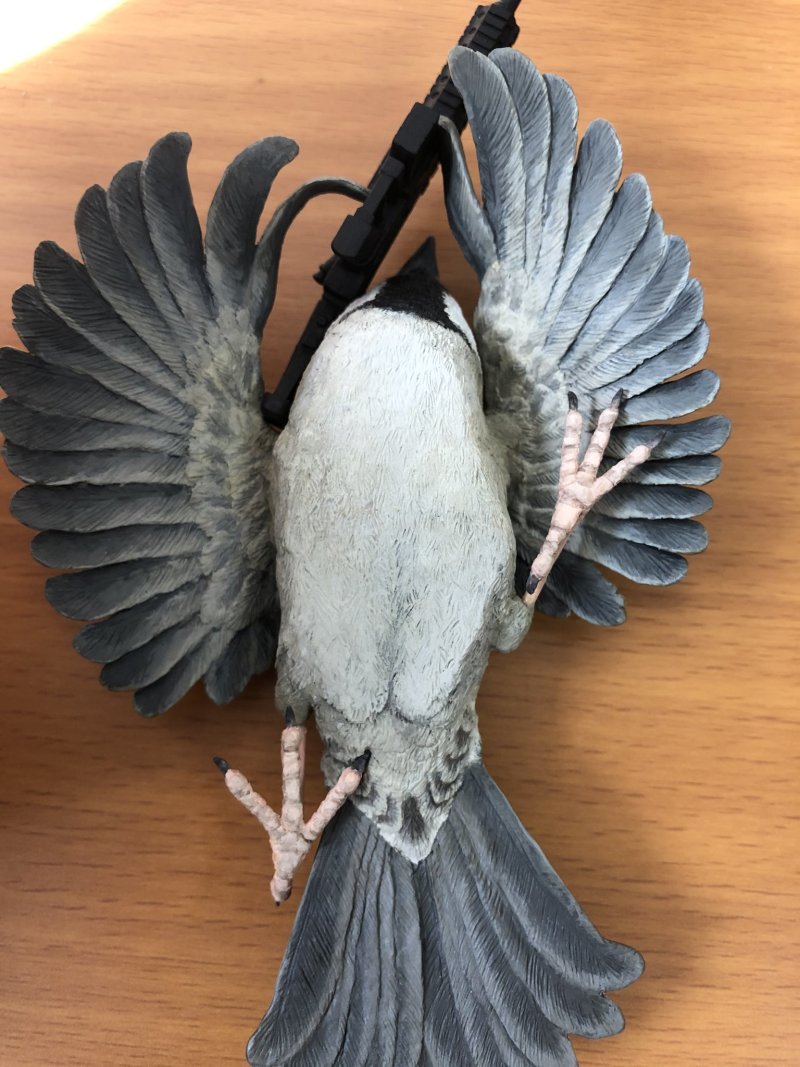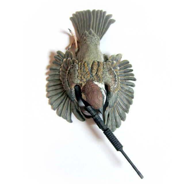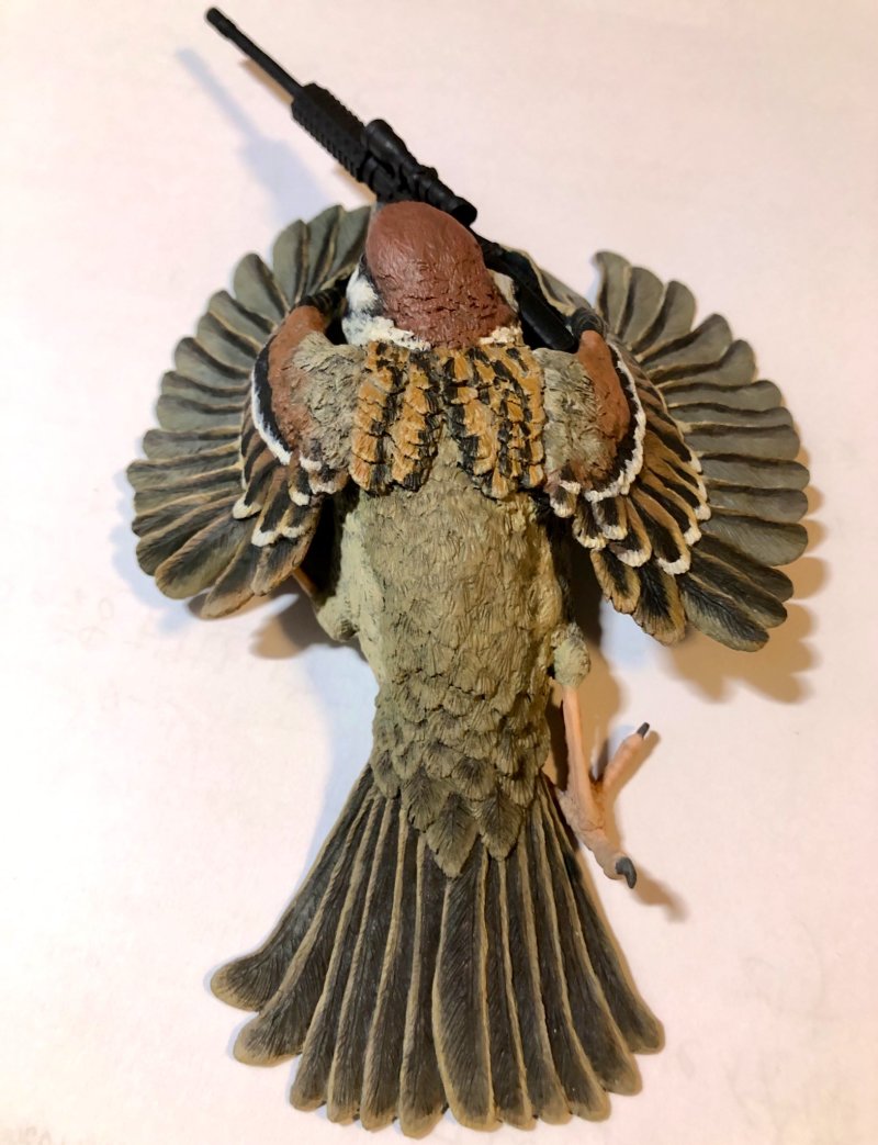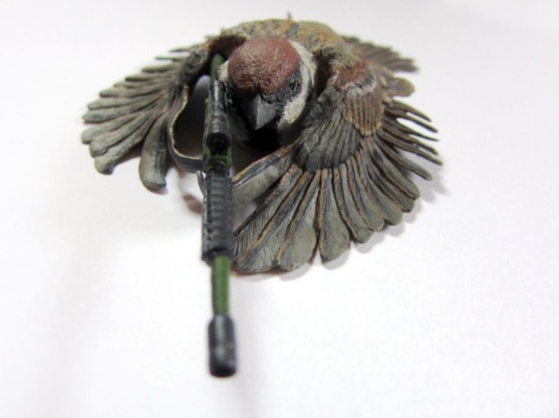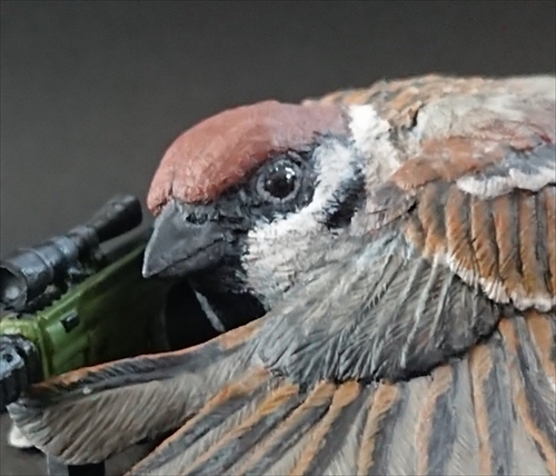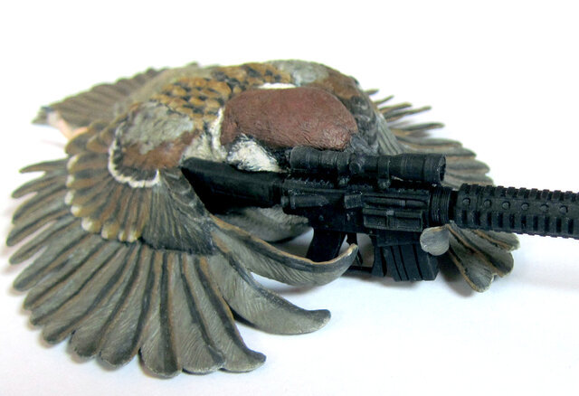 而先前 ヤトウナオコ 以樹脂製作的全新系列作品「麻雀狙擊手」模型,因粉絲們強烈敲碗終於商品化!在將近 1:1 真實比例的 16 × 12公分尺寸中,栩栩如生還原麻雀的羽毛細節、展開的雙翼和炯炯有神的雙眼等,並以純手工細膩塗裝,將特徵毛色仔細擬真呈現;底部看精細的腹部小細毛與生動的小腳,滿滿細節令人驚豔~最重要的是巧妙地把麻雀趴姿動作結合狙擊槍,可愛的小麻雀瞬間變成煞氣狙擊手!再說麻雀雖小?小心下一個被瞄準的就是你!