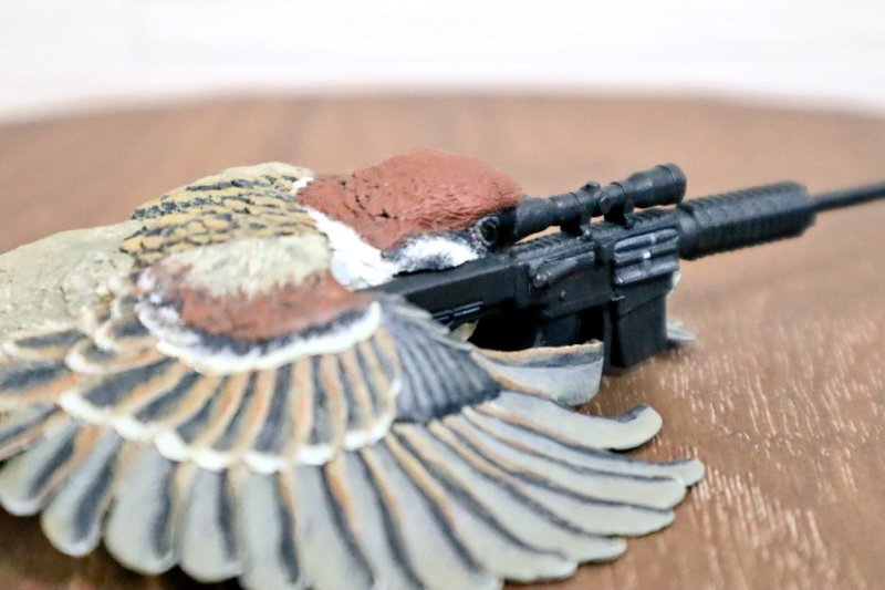 擅長製作「日常生活中的鳥類」手創作品的日本設計品牌 CHUN ,旗下引起網路熱議的趣味商品「麻雀狙擊手」模型,精緻擬真的可愛麻雀外觀卻加上凶狠的狙擊槍造型,衝突的反差萌讓許多玩具人想收藏,立即搶售一空。