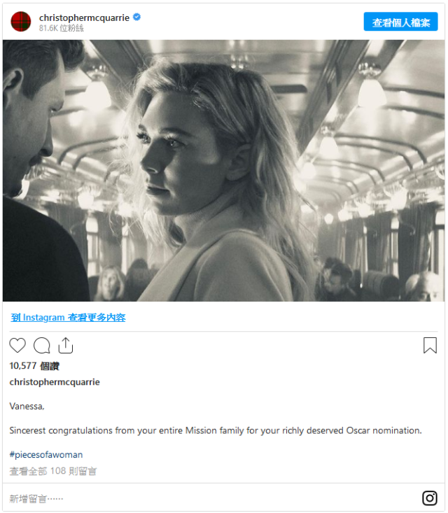 克里斯多福在貼文中寫到:「凡妮莎,你的整體『任務家人』誠摯的恭喜你獲得這項當之無愧的奧斯卡提名。」