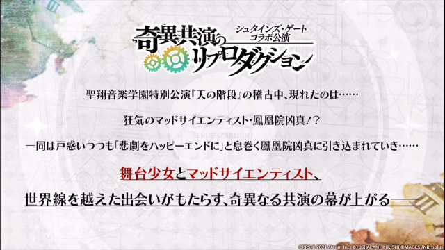 《命運石之門》剛過10周年紀念,近期又以「世界線變動0.210317%」為噱頭行銷,本次(16)由《少女歌劇》公開合作消息,確定兩IP合作的內容預告,除了《命運石之門》男主角岡部侖太郎(鳳凰元兇真)擺出招牌姿勢外,另外也讓大場奈奈、星見純那 穿上熟悉的研究員白袍做形象擔當。