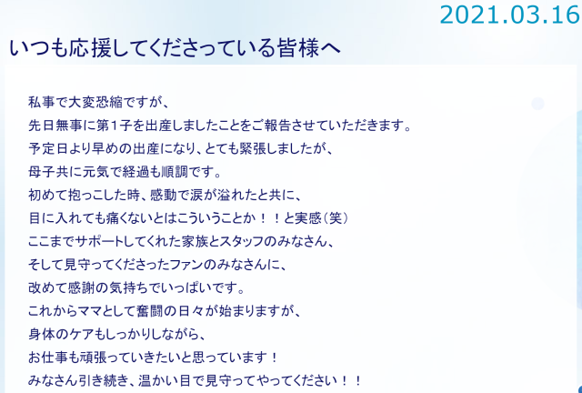 在去年宣布與自己音樂事業有關聯的男性結婚後,水樹奈奈仍在工作上持續努力,直到年底宣布懷孕的消息工作上稍作休息,沒想到比起預期中還要早生產。水樹奈奈也提到,第一次抱著孩子時,也不禁感動落淚,一切都如此真實。十分感謝支持他們家庭的粉絲與工作人員,雖說成為母親後可能迎來繁忙的日子,不過還是會繼續努力在工作上,保持身體健康並帶給更多粉絲優秀的演出。