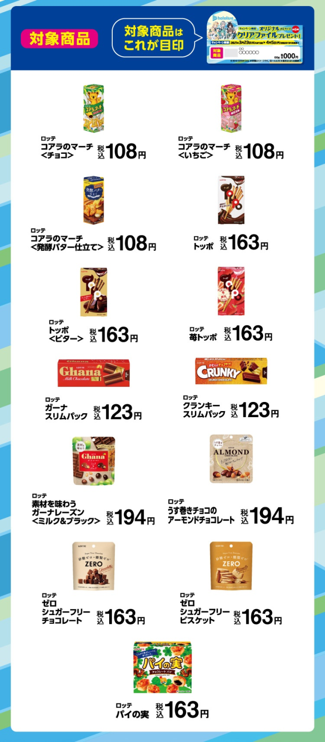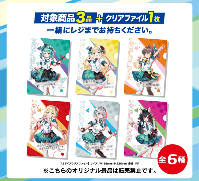 這次同樣有上次人氣十分狂熱的零食贈品的活動,同樣是購買 Lotte 旗下的零食,三款就可以換得一個聯名 A5 資料夾。本次出場的 Vtuber 有一期生-赤井心、夏色祭;三期生-白銀諾艾爾、潤羽露西婭;四期生-角卷綿芽及 Gamer-大神澪。