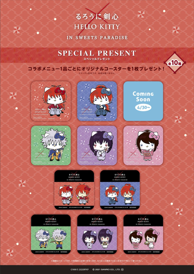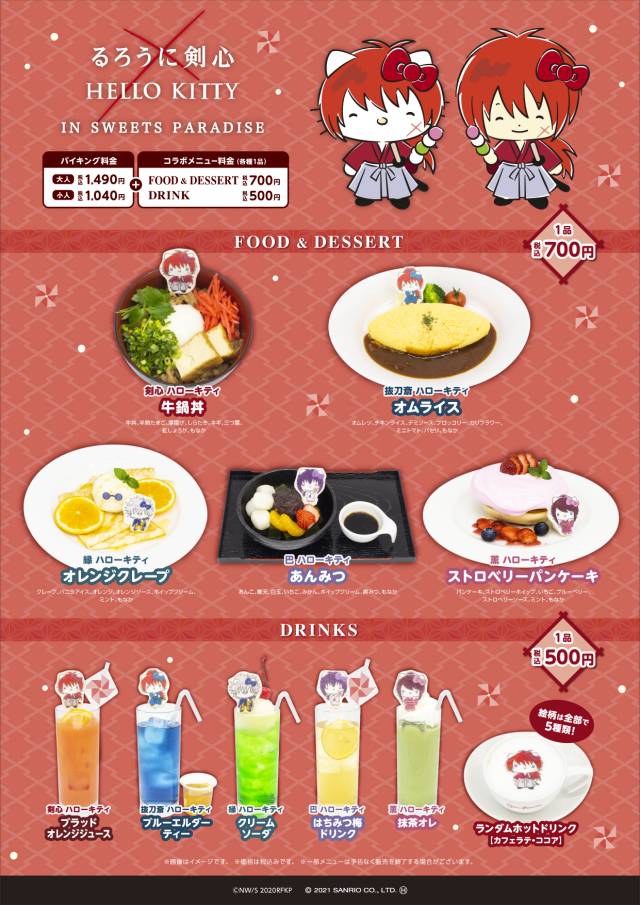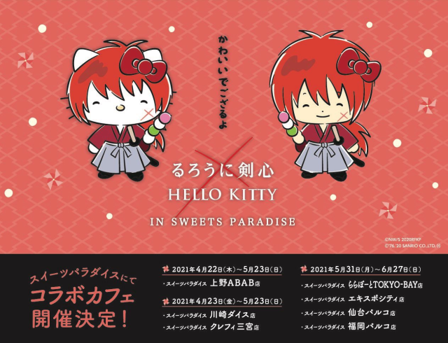 將於今年 4 月有真人版電影上映的《神劍闖江湖 最終章》,在去年也是《神劍闖江湖》作品的 25 周年,近日宣布將與三麗鷗旗下的卡通角色 Hello Kitty 一同跟日本連鎖的甜點吃到飽餐廳 「SWEETS PARADISE」合作,推出期間限定的聯名餐點,並設計了可愛風格的劍心與 cos 劍心的 Hello Kitty 視覺圖。活動將於 2021 年 4 月 22 日上野 ABBA 店開始起跑,各間連鎖店鋪也將於不同時間陸續展開活動。