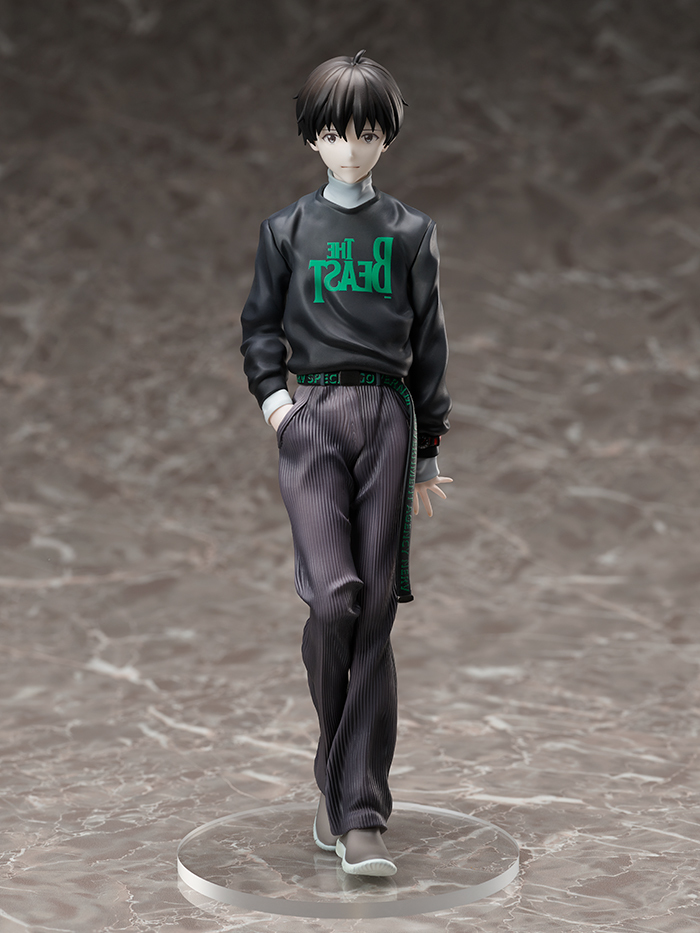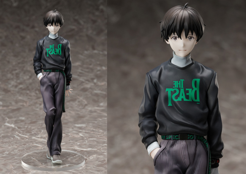 最後一位登場的角色「碇真嗣 Ver.RADIO EVA」1/7比例模型,使用全彩塗裝將米山舞所繪製的插畫立體化。尺寸全高約 260 mm,穿著內搭高領的「THE BEAST」長袖T-Shirt,著用 NERV ARMY LOGO腰帶、亮眼的藍色休閒鞋,真的很會穿搭~單手插口袋、略低著頭的站姿加上似乎帶著淡淡微笑的表情,整體更增加帥氣和成熟感。