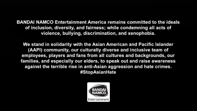 而萬代南夢宮則同樣表態「致力於包容、多樣性與公平理念,並譴責暴行、歧視和仇視行為。」,並與Asian American and Pacific lslander (亞裔美國人太平洋聯盟)共同提倡反亞裔仇視行動。