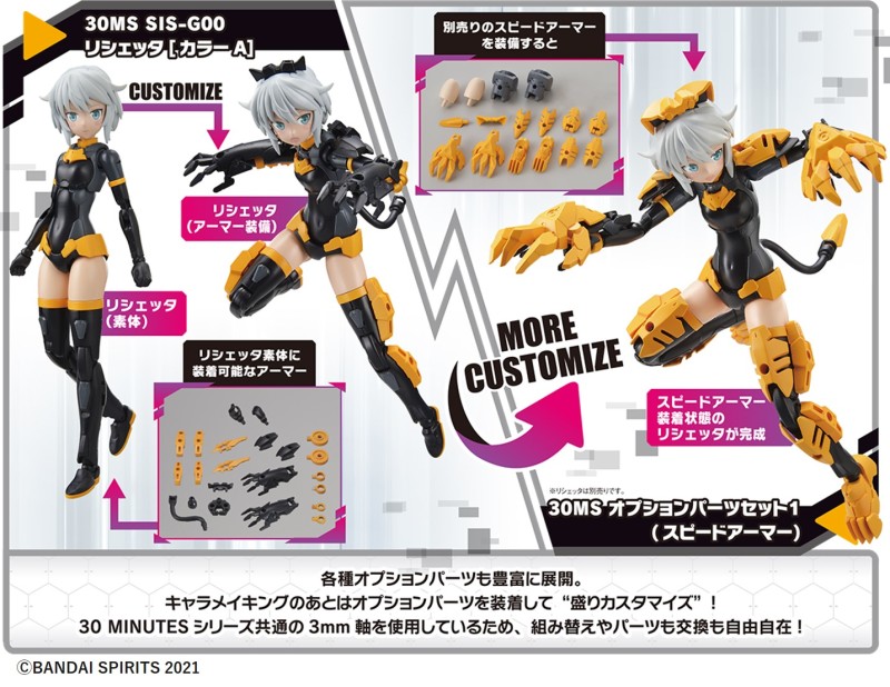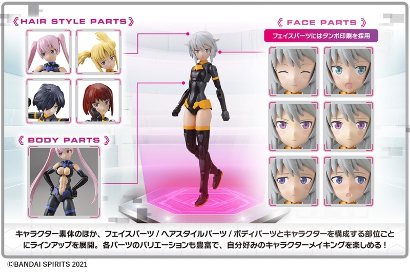 『30 MINUTES SISTERS』系列是由『30MINUTES MISSIONS』衍生而來的美少女組裝模型,邀請到島田文金、柳瀨敬之、海老川兼武等優秀設計師參與,未來預計會有更多設計師加入。延續 30MM 系列特色,商品除了角色素體外,也將推出非常多樣的表情零件組、髮型零件組、身體零件組、武裝零件組等豐富配件,全系列零件採用相同規格的 3mm 卡榫,讓玩家無須加工改造就能自由換裝。