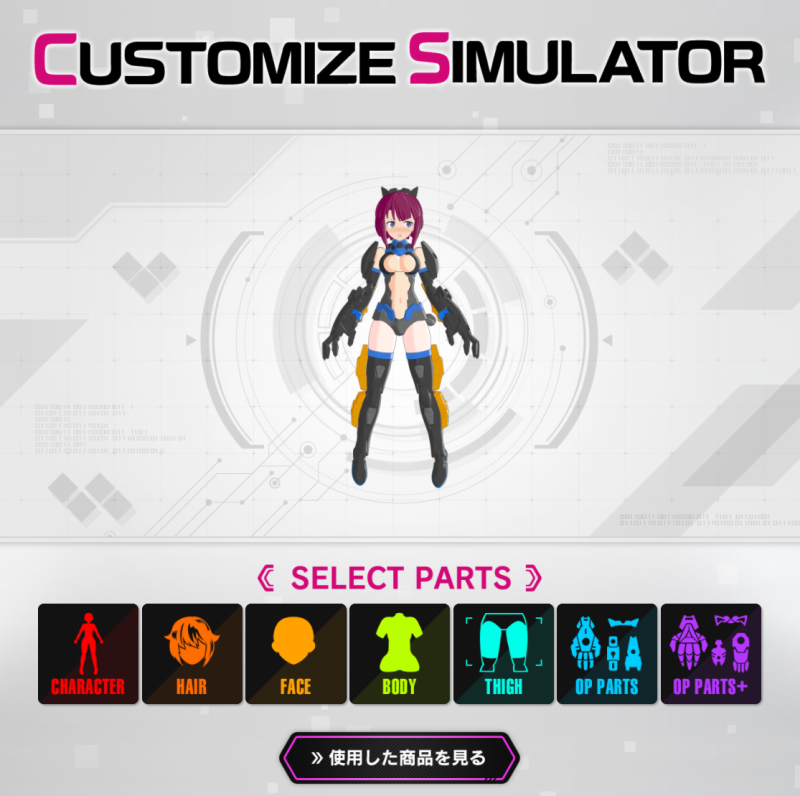 另外在官方網站裡也有非常方便的紙娃娃「換裝模擬器」,在購買模型前就能先行嘗試各個零件搭配出來的效果,並且快速找到所需的配件商品!