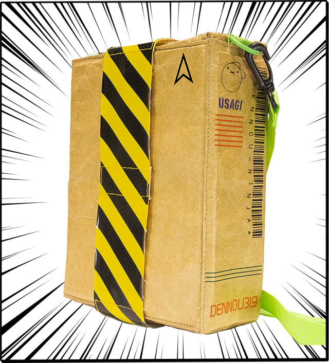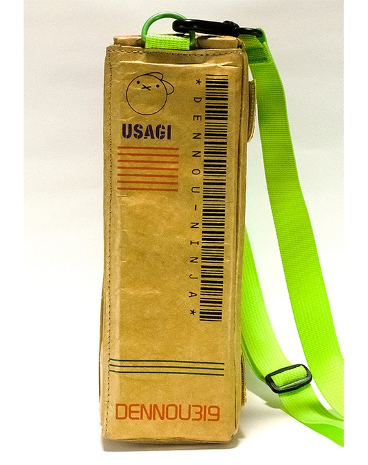 另一側同樣與先前「瓦楞紙背包」有同樣的圖案設計,以原創的「DENNOU319」產品系列為題,放上專屬的兔兔 Logo 與條碼設計 。