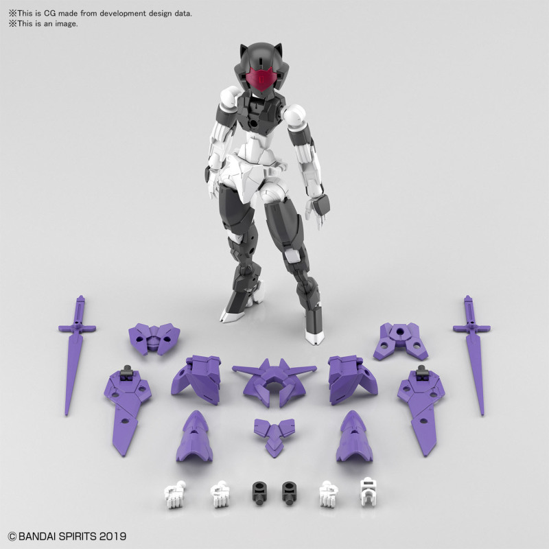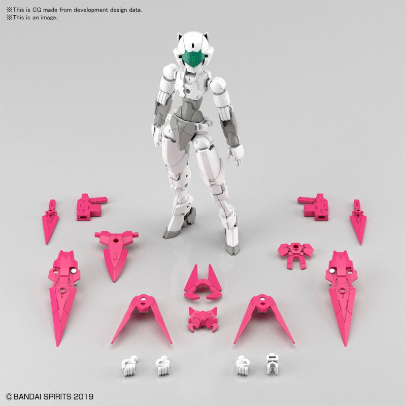 女性型素體「1/144 EXM-E7 司比納帝亞」將於 2021 年 07 月推出「司比納帝亞 擊劍規格」,2021 年 08 月推出「司比納帝亞 刺客規格」。套件中包含素體、造型手掌、武裝一應俱全,可針對需求自行上色。且零件構造更加進化,完全沒有使用卡榫密合的內嵌式零件,提昇可動範圍與組裝方便性。通用關節構造與 3mm 接點皆能運用過去商品進行改裝。