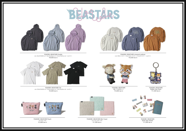 這也是 YOASOBI 首次與動漫作品聯名的商品,包含了服飾、娃娃、吊飾、隨身包等等。將 YOASOBI 的音樂風格結合《BEASTARS》的動物元素,打造融合兩者的嶄新面貌。