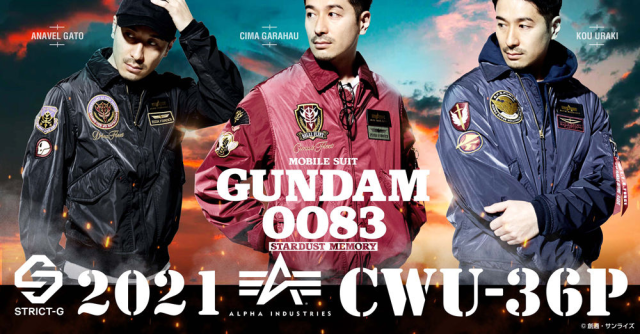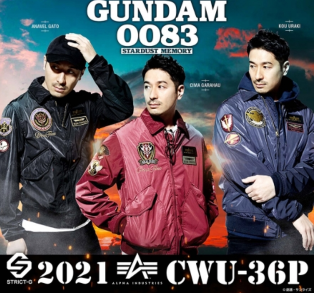 鋼彈官方的潮流品牌 「STRICT-G」在這一兩年推出了多款聯名商品,其中與知名品牌 ALPHA INDUSTRIES 推出廣受好評的《機動戰士鋼彈》聯名款 MA-1 飛行夾克、「蘭巴‧拉爾 M-65 野戰夾克」與《機動戰士鋼彈》輕量MA-1 08小隊LIGHT MA-1 飛行夾克後,這次將聯手推出:「STRICT-G × ALPHA CWU-36P 」《機動戰士鋼彈 0083:STARDUST MEMORY》聯名外套!售價為 36,300 日圓,共有三款可供選擇。