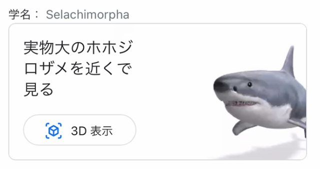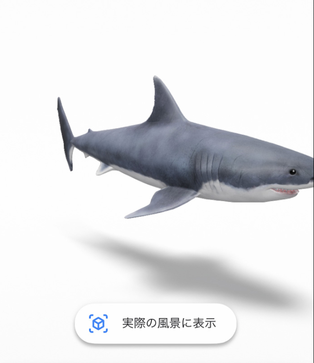 原來,是Google App的「AR功能」,該推文是示範只要在Google上搜尋「サメ」(鯊魚),之後搜尋結果會出現一個「近距離見識實體大小的大白鯊」這樣的窗格,並且有「透過3D模式檢視」的選項,透過3D模式檢視後你可以旋轉鯊魚來看牠的全身,而特定手機又有一個「実際の風景に表示」的選項,點選後就能讓大白鯊進入現實。