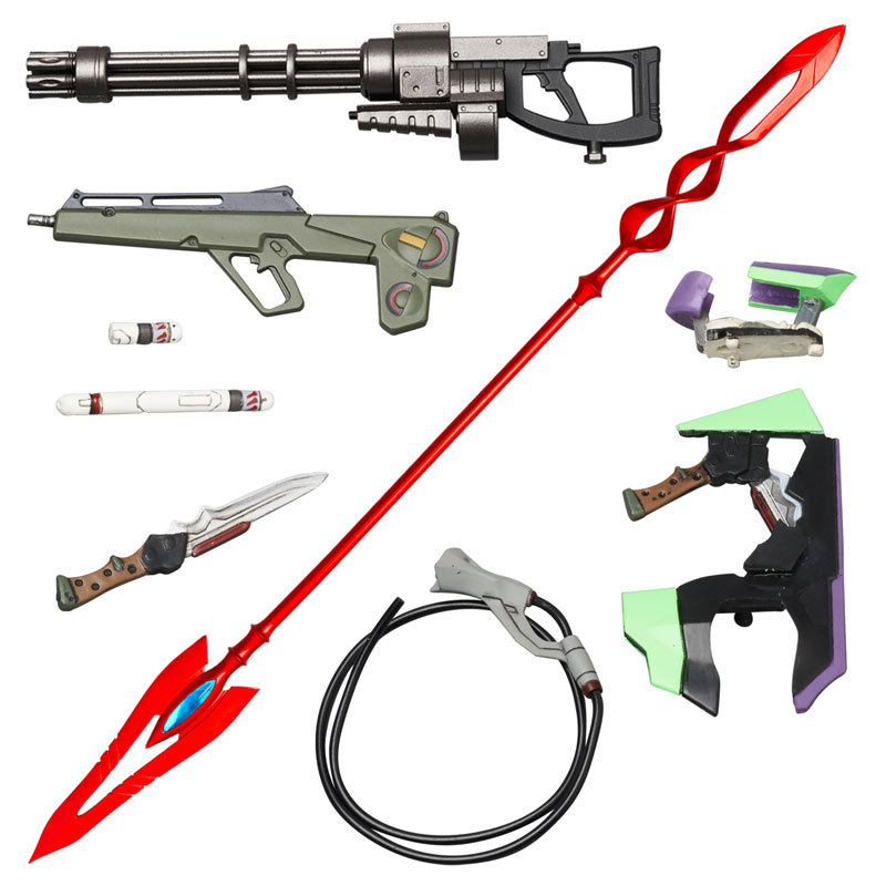配件還附有專用台座、電磁步槍、格林機槍、高振動粒子刀等武裝,以及長度近乎本體的大魄力「卡西烏斯之槍」,鮮紅塗裝搭配透明零件製作,能與另售的「MAFEX NEO EVA 第 13 號機」再現預告中出現的對決場景!