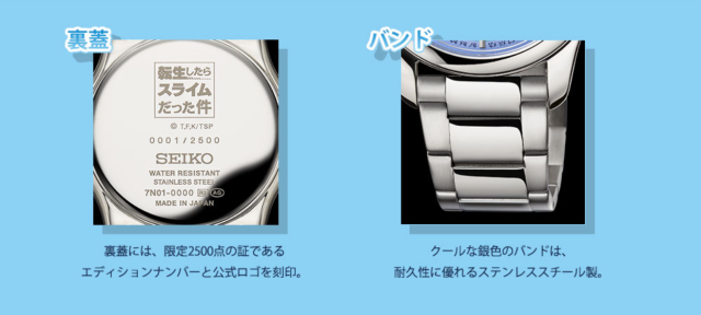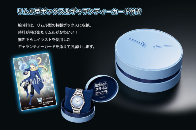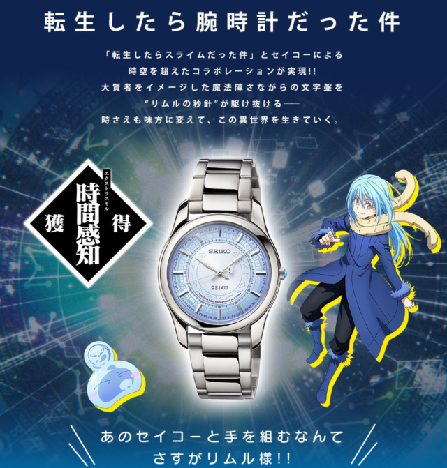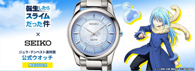 日本知名鐘錶公司 SEIKO 將與日本人氣小說改編動漫作品 《關於我轉生變成史萊姆這檔事》攜手推出聯名限量手錶, 以利姆路・坦派斯特與其創建的朱拉・坦派斯特聯邦國為主題設計。售價為 43,780 日圓,預計將於 2021 年 8 月上旬正式發售,限量 2,500 組。