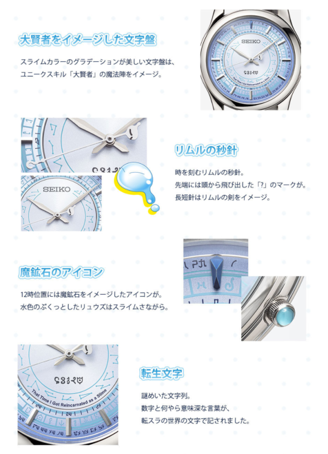 SEIKO 與眾多日本動漫 IP 合作過,推出手錶商品已經不算新聞了 XD。這次與《關於我轉生變成史萊姆這檔事》合作,錶面以主角利姆路・坦派斯特職業『大賢者』 為靈感魔法陣設計,搭配史萊姆的秒針與 12 點鐘處的魔鉱石設計。外圍環繞著異世界的轉生文字,藉此呈現作品的世界觀。