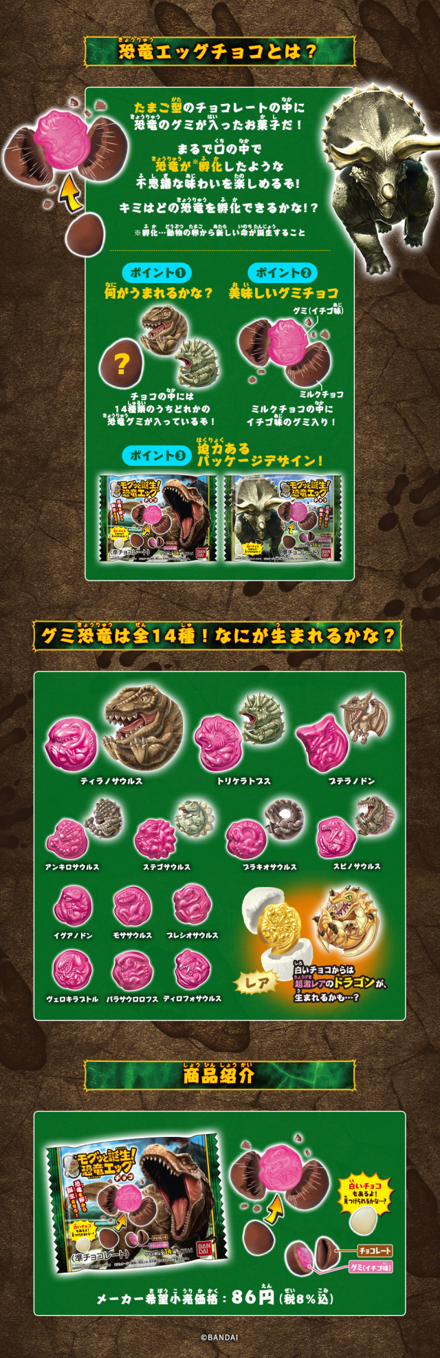 日本 BANDAI 萬代玩具公司旗下食玩事業部「BANDAI CANDY」,常常以各種動漫 IP 來製作點心零嘴吸引消費者。這次改以大小朋友都喜愛的「恐龍」為題材出發,推出「恐龍蛋巧克力球」,共計 14 種恐龍等你來發掘。售價為 86 日圓,目前已可以在日本超商與量販店通路購買。
