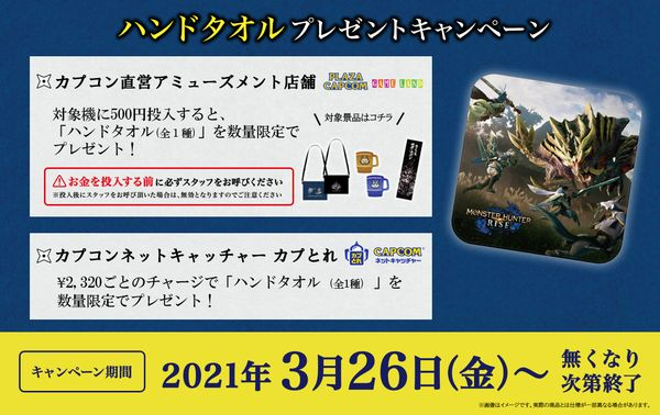 另外,在卡普空直營的遊樂場內投入 500 日圓,以及在卡普空的線上夾娃娃「カプコンネットキャッチャー カプとれ」儲進 2320 日圓,就能免費獲得「魔物獵人 崛起 手巾」一枚,作為宣傳活動的禮物。有數量限定,發完就沒了。