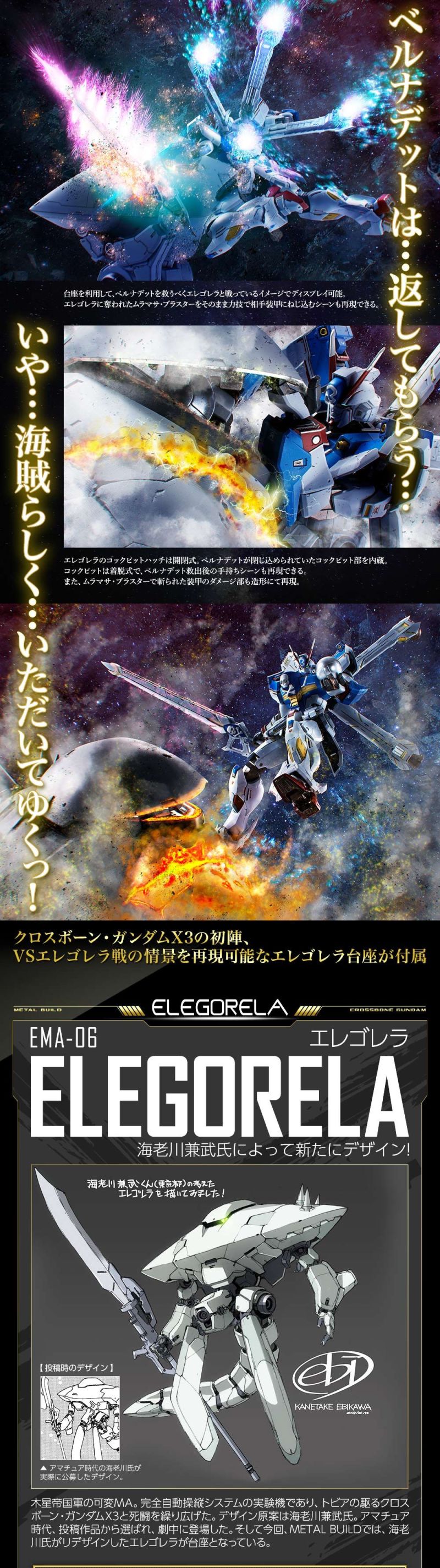 台座造型則是由海老川兼武新設計的木星帝國軍可變MA「EMA-06 ELEGORELA」部份身軀,再現遭 X3 斬擊的受損部位以及貝娜提·布里耶的駕駛艙,能夠再現托比亞救出貝娜提的經典場景!