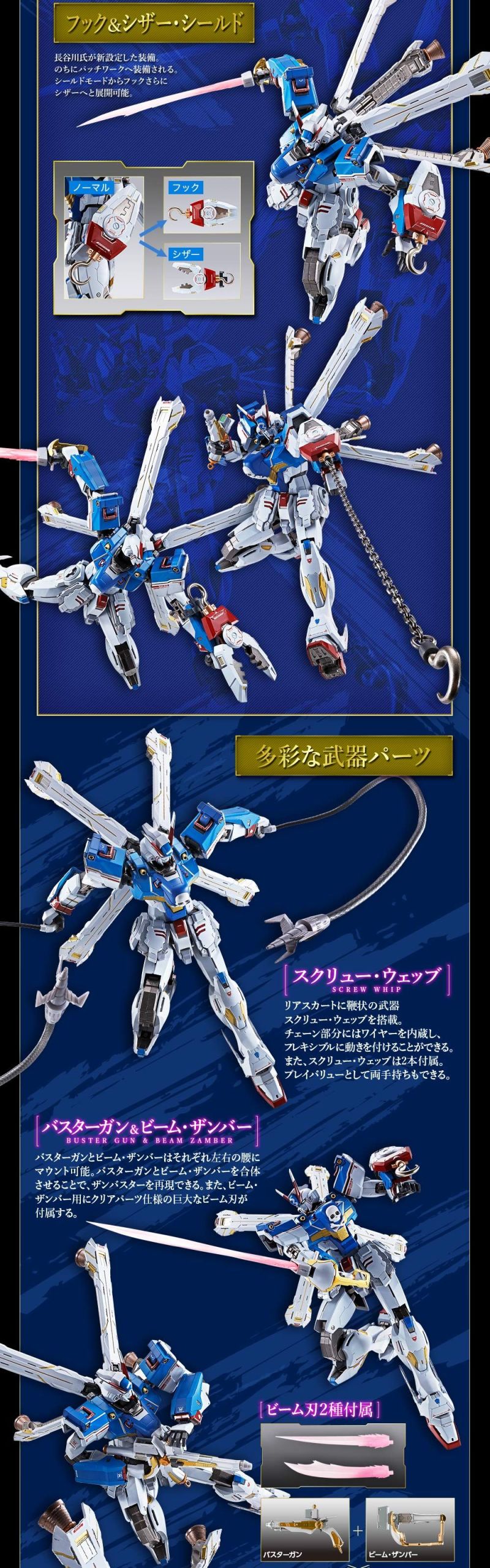 商品內容:本體、替換用頭部、替換用左手掌4種、替換用右手掌5種、替換用頭部天線、核心戰機、破壞槍、彈頭、村正狂刀、村正狂刀用連接零件、村正狂刀用特效零件、光束斬刀、光束斬刀刃2種、光束盾 ×2、熱能短刀刃 ×2、光束軍刀刃 ×2、剪型錨用金屬鍊 ×2、核心戰機用連接零件、專用台座一組、ELEGORELA台座一組