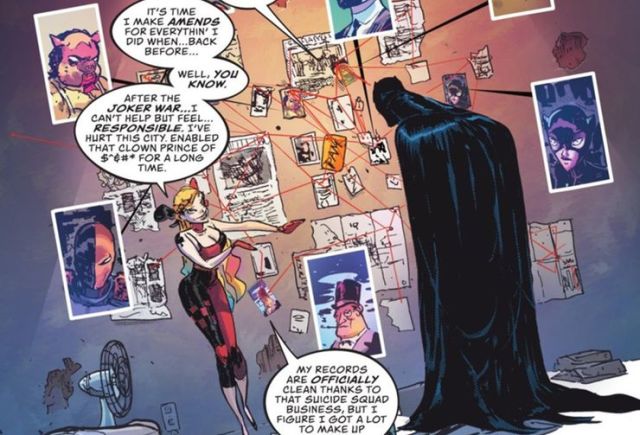 雖然可以看到哈莉堅定的想要彌補,甚至似乎想在計畫完成後試圖與毒藤女(Poison Ivy)復合:但明顯的是,蝙蝠俠並沒有完全相信她。