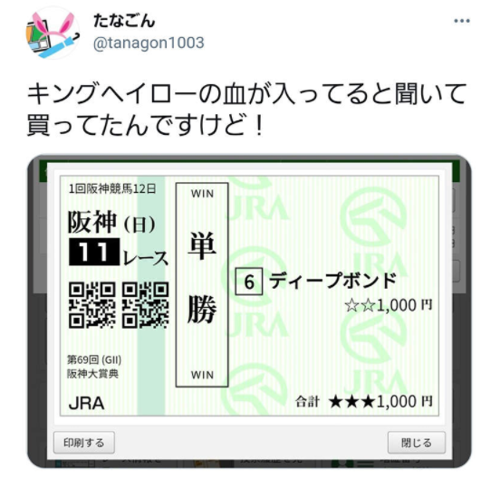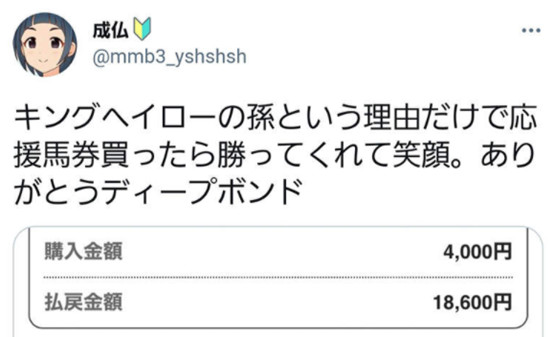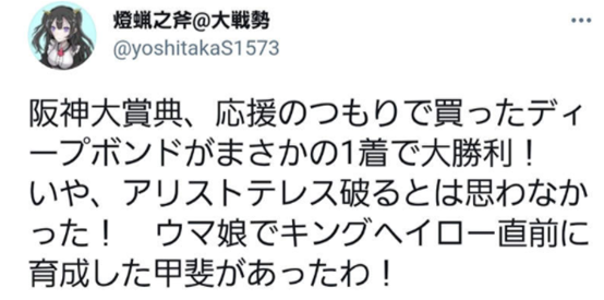 近期(21)日本的「阪神大賞典」中, Deep Bond(ディープボンド)的出賽引起玩家的關注,因為她是「帝王光輝King Halo(キングヘイロー)」的子嗣,在作品中也經過萌化登場而成為粉絲話題(根據血統表,King Halo是 Deep Bond的外公),在作品中以不服輸的大小姐作為形象。
