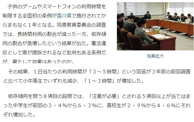 在去年,香川縣政府疑似黑箱作業而快速通過的《網路、遊戲成癮對策》針對學生族群進行嚴格的遊戲時間管控,雖然沒有任何懲處方案,但軟性規定18歲以下的學生每天不得玩超過一小時,而在本次(24)滿周年時,由政府教委會公布結果,居然呈現「學生遊戲平均時間下降,但沉迷症狀增加」的意外數據。