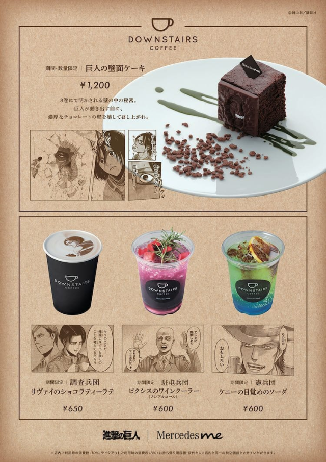 除此之外,聯名餐點也是別具匠心,以巨人的主題設計餐點外。一樓是DOWNSTAIRS 咖啡店,而二樓是 UPSTAIRS 餐廳。DOWNSTAIRS 以點心與飲料為主;UPSTAIRS 則提供精緻的料理組合。