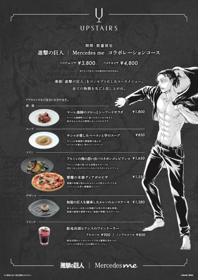 由諫山創創作的漫畫作品《進擊的巨人》,近期播放動畫最終季,不論是主題曲或 是劇情都引發不少網路上的討論。近日宣布與汽車品牌 Mercedes-Benz 展開合作,與旗下於日本東京六本木的餐廳「Mecedes me」聯名,販售主題餐點,更會展示 Benz 與《進擊的巨人》合作的車款,活動將於 2021 年 3 月 27 日至 4 月 25 日止。