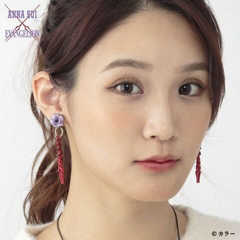 以經典的 ANNA SUI 紫色玫瑰結合福音戰士中的朗基努斯之槍,製作成精美華麗的耳環款式。售價為 16,500 日圓。