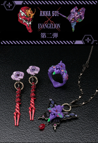 推出的商品將以《新世紀福音戰士》中的初號機與朗基努斯之槍的概念來設計,結合 ANNA SUI 獨有的流行華麗特色,打造出專屬女性時尚的 EVA 風格,華麗的首飾搭配福音戰士的風格,有種奢華又狂野的味道。