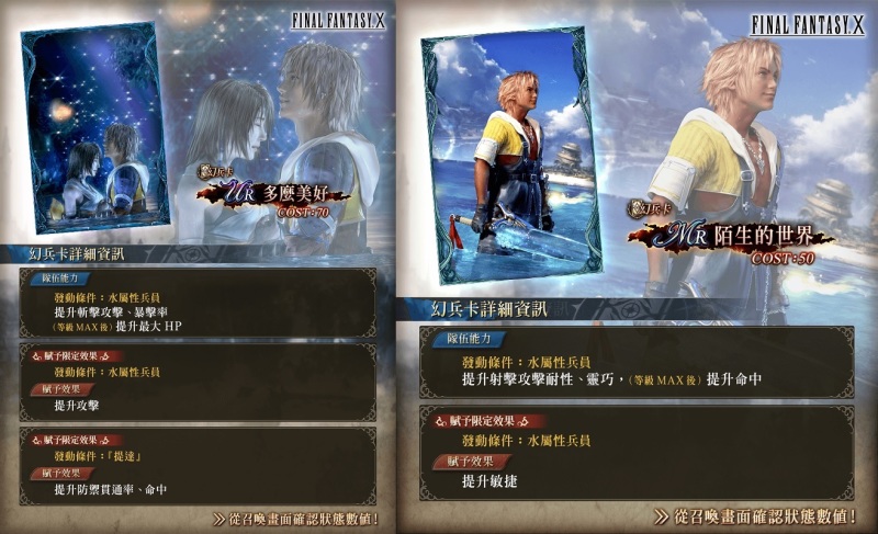 全新的幻兵卡「多麼美好」與「陌生的世界」:於此同時,透過期間限定的精選召喚,您還有機會獲得兩張全新聯動活動幻兵卡「多麼美好」與「陌生的世界」,此兩張幻兵卡在各種情況下對玩家都很有幫助。欣賞幻兵卡的美術視覺,讓我們一起重溫《FFX》最經典的畫面吧!