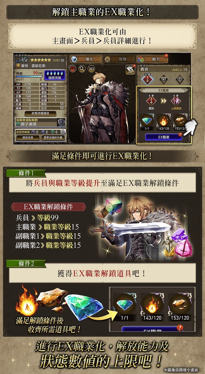 「EX職業」:滿足指定的解鎖條件,以及蒐集所需的解鎖道具後,即可解鎖主職業的EX職業化!開放解鎖EX職業的兵員包含『優娜 (UR)』(期間限定)、『提達 (UR)』(期間限定)、『羅布·霍倫 (UR)』、『奧爾德·雷歐尼斯 (UR)』、『斯特恩·雷歐尼斯 (UR)』、『奧爾多 (UR)』、『蒙特·雷歐尼斯 (MR)』、『巴埃羅 (SR)』、『莉雅特(R)』。