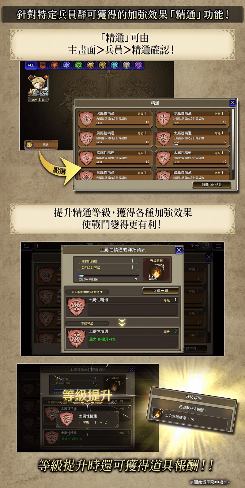 「精通」:此新功能可提升特定兵員群的累積等級,所屬的兵員群的所有兵員皆可獲得加強效果。透過提升精通等級,獲得各種加強效果,使戰鬥變得更有利!