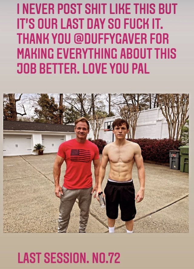 「我很少發這種東西的,但都最後一天了我才不管呢幹。感謝 @DuffyGaver 讓這工作變得更美好,愛你。最後一堂訓練課,也是第72堂。」