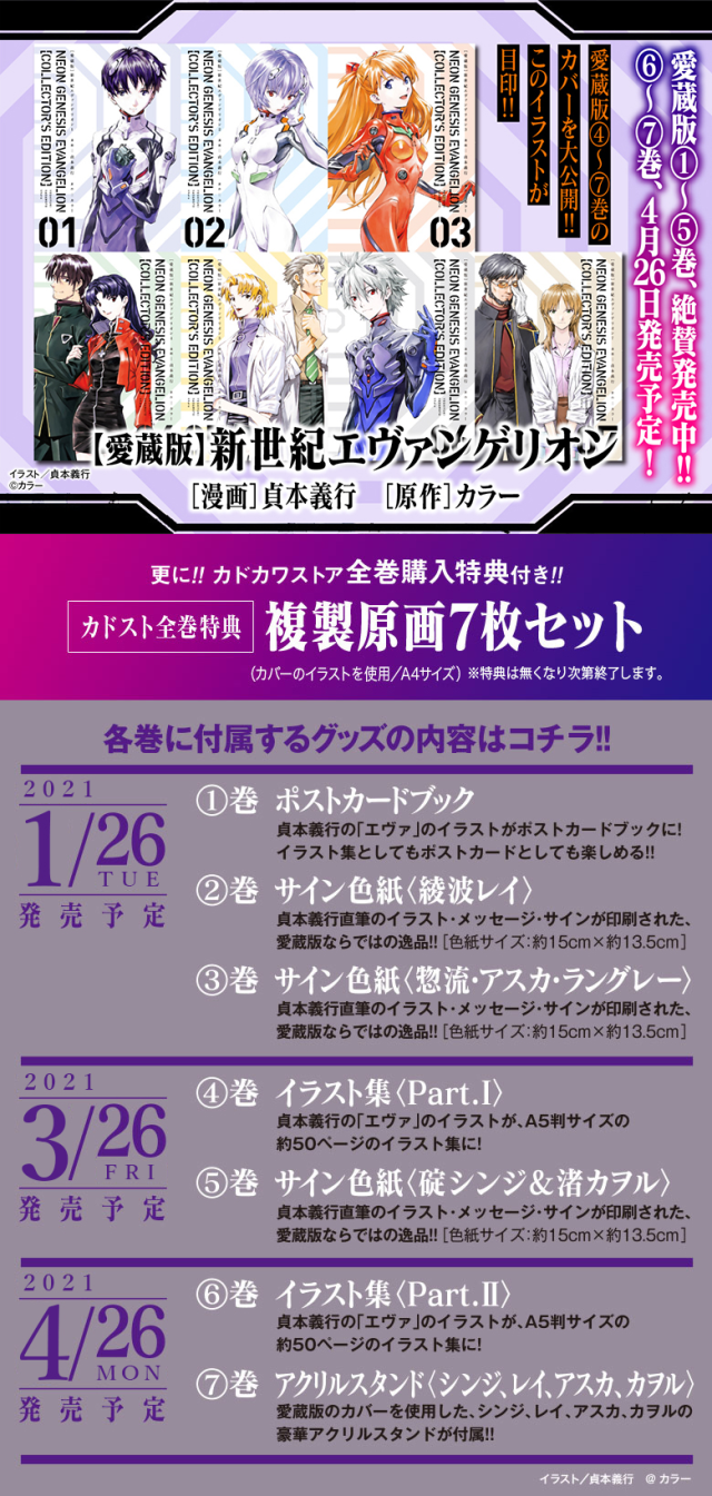 由日本出版公司角川(株式會社 KADOKAWA)發行的人氣漫畫作品「《新世紀福音戰士 EVANGELION 》愛藏版」,在公布了分別為真嗣、綾波零、明日香的 1 ~ 3 冊、加持與美里、冬月與律子的第 5 冊與渚薰的第 6 冊封面繪圖後,終於將全部 7 冊的封面繪圖完整呈現啦!第 7 冊將由碇唯與碇源堂擔綱,6 ~ 7冊預計將於 2021 年 4 月 26 日上市。