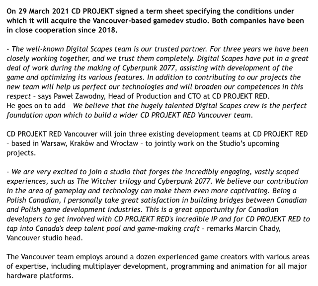 CDPR的《電馭叛客2077》近日除了發布一連串「打這麼多誰看的完」誠意更新之外,也接連在公司策略有所躍進:從遊戲分析師Daniel Ahmad自推特公布的29號簽署文件上,承認了CD PROJEKT和Digital Scapes收購後的從屬關係,並透露兩方自2018年來在保密下的合作往來。