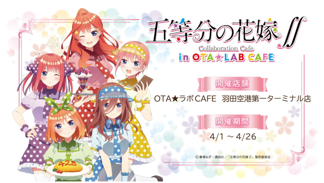 在日本有不少店鋪的主題咖啡廳「OTA★ラボ CAFE (オタラボカフェ)」將於 2021 年 3 月 10 日在羽田機場開設新店舖,開幕找來《炎炎消防隊》合作主題咖啡廳。接續著將與甫宣布動畫續篇製作的動漫作品《五等分的花嫁∬》推出主題咖啡廳,將於 2021 年 4 月 1 日〜 4 月 26 日為約一個月的期間限定開設。