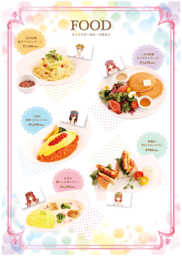 餐點包含;「一花最喜歡的鹽辛義大利麵 」、「二乃特製蜂蜜奶油鬆餅佐沙拉」、「三玖第一次做的歐姆蛋包飯」、「四葉的辣味可樂餅麵包」與「五月的貪吃鬼燉飯」。