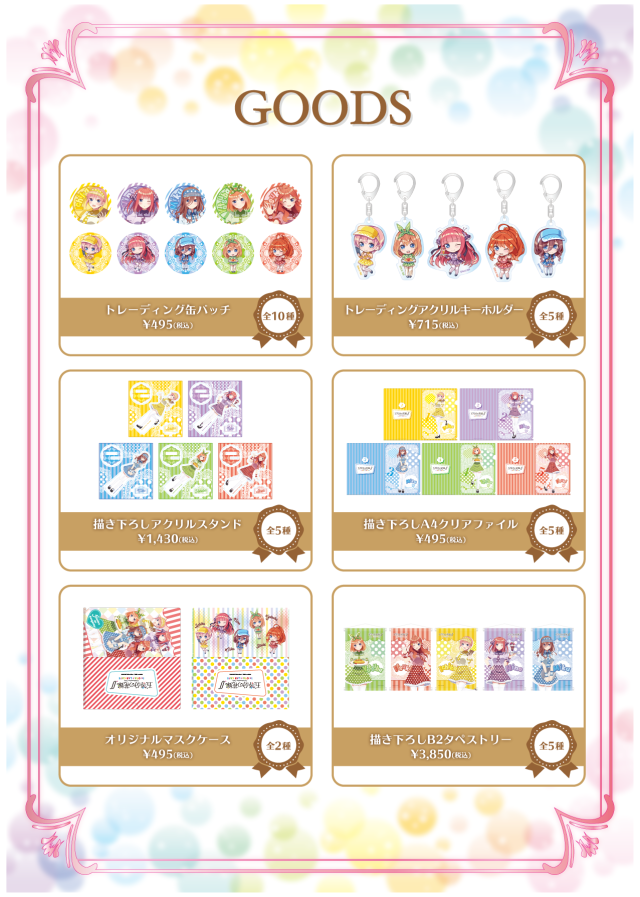 合作咖啡廳當然少不了周邊商品販售,包含;胸章、鑰匙圈、人物立牌等各種原創周邊,皆以本次合作的形象呈現,喜歡中野五姊妹穿上服務生的朋友不能錯過啦 !