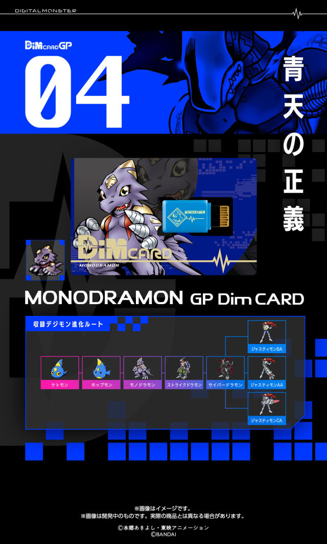 這一次的「Dim CARD GP vol.01 デジモンテイマーズ」也率先公布了完整四隻數碼獸的進化路線,可以看到四張Dim卡的部分到完全體以前均為單一路線,一直到究極體才有分支變化,初估判斷可能與黑暗戰鬥暴龍獸/黑暗鋼鐵加魯魯一樣為試玩版。