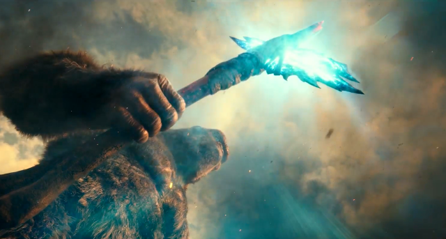 片中金剛所持的那把斧頭,無疑是最後香港大戰的關鍵武器,許多粉絲猜測,斧頭上的生物鱗片是出自哥吉拉的背鰭,這就是為何斧頭能夠抵擋並吸收哥吉拉射線的原因,而編劇鮑倫斯坦也在訪談中證實了這點。他解釋,哥吉拉的鱗片有導電、放射性的性質,而靈長類的金剛族有更進化的文明,有能力運用哥吉拉的脊柱去打造這樣的武器,「可能還有更多像這樣的造物,但這感覺也像是國王的標誌性權杖。」鮑倫斯坦表示。