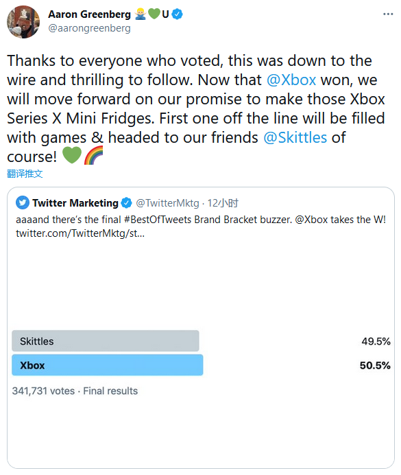 近期推特發起「最具影響力品牌」,進行了14場勝負對決時,陷入了「Xbox」和彩虹糖「Skittles」兩大企業的總對決,此時Xbox銷售部經理Aaron Greenberg提出了殺手鐧:「只要我們獲勝,就開始生產XSX迷你冰箱,這絕對不是愚人節笑話!」最後活動於4/2結算,比分以50.5%和49.5%畫下句點,由「Xbox」1%險勝。