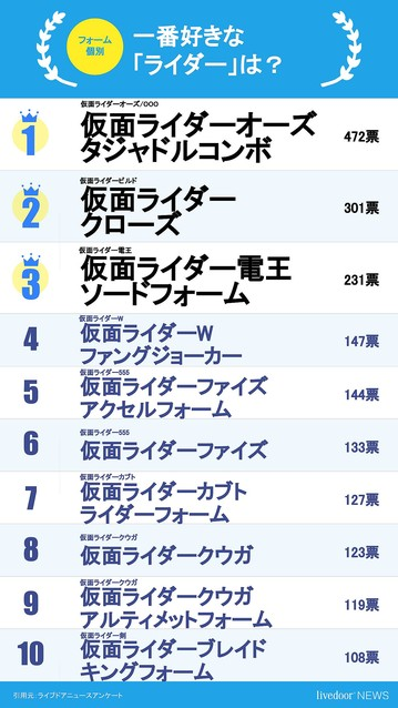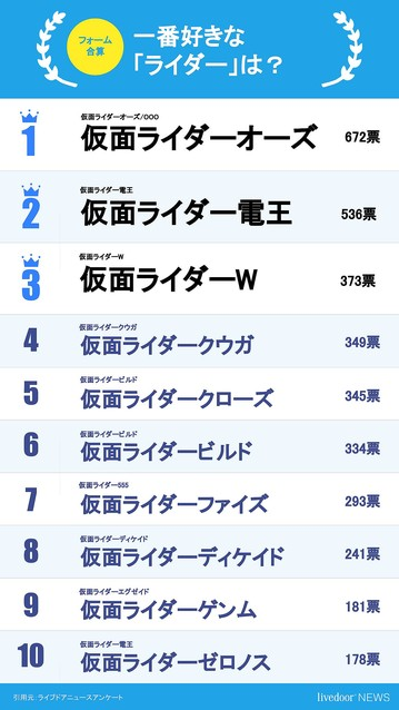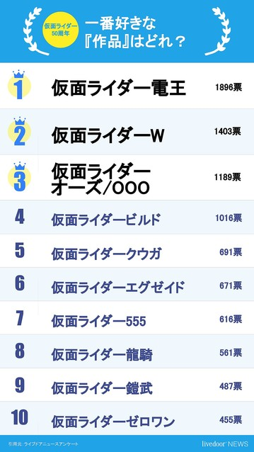 livedoor NEWS在今日做了一項問卷調查,並分為兩部分,一個是「喜歡的假面騎士作品」另一個則是「喜歡的假面騎士」,而後者還分有「型態別」和總和的,而作品和騎士的涵蓋範圍當然是昭和~令和三代的全部作品和騎士,收集的問卷數達12846件,這次我們就不一一詳解,直接來看這三個部份的排行吧!